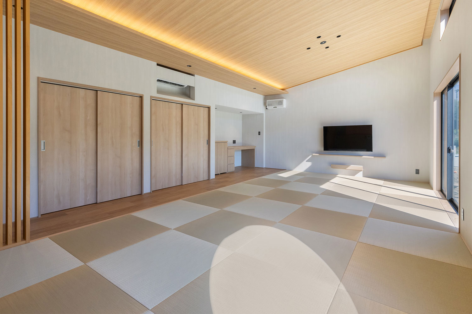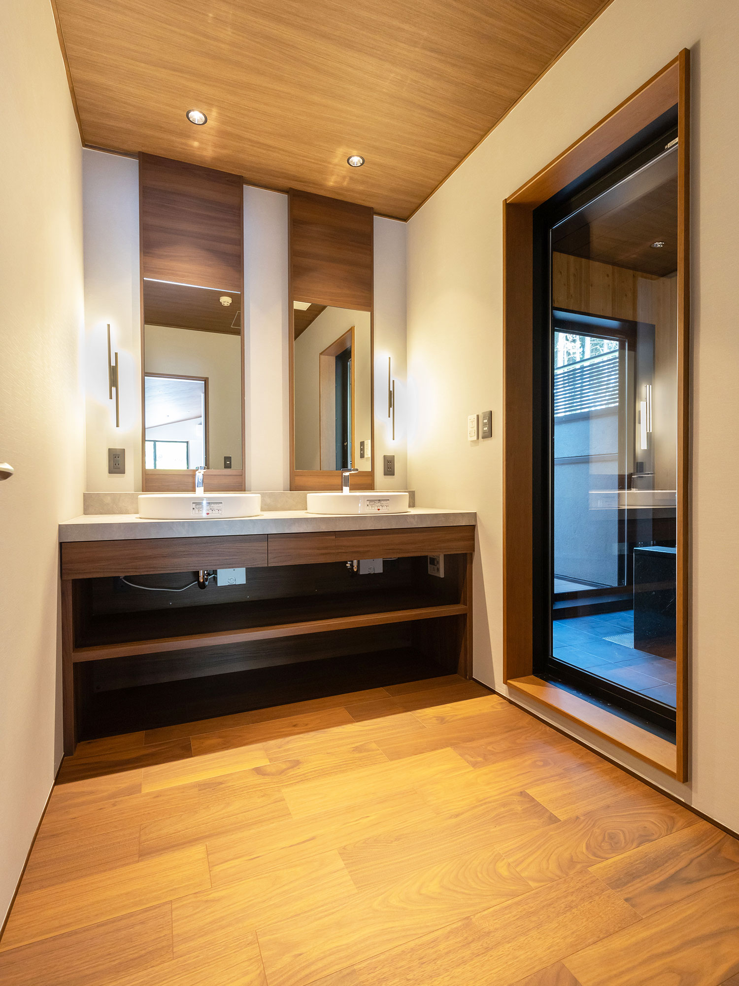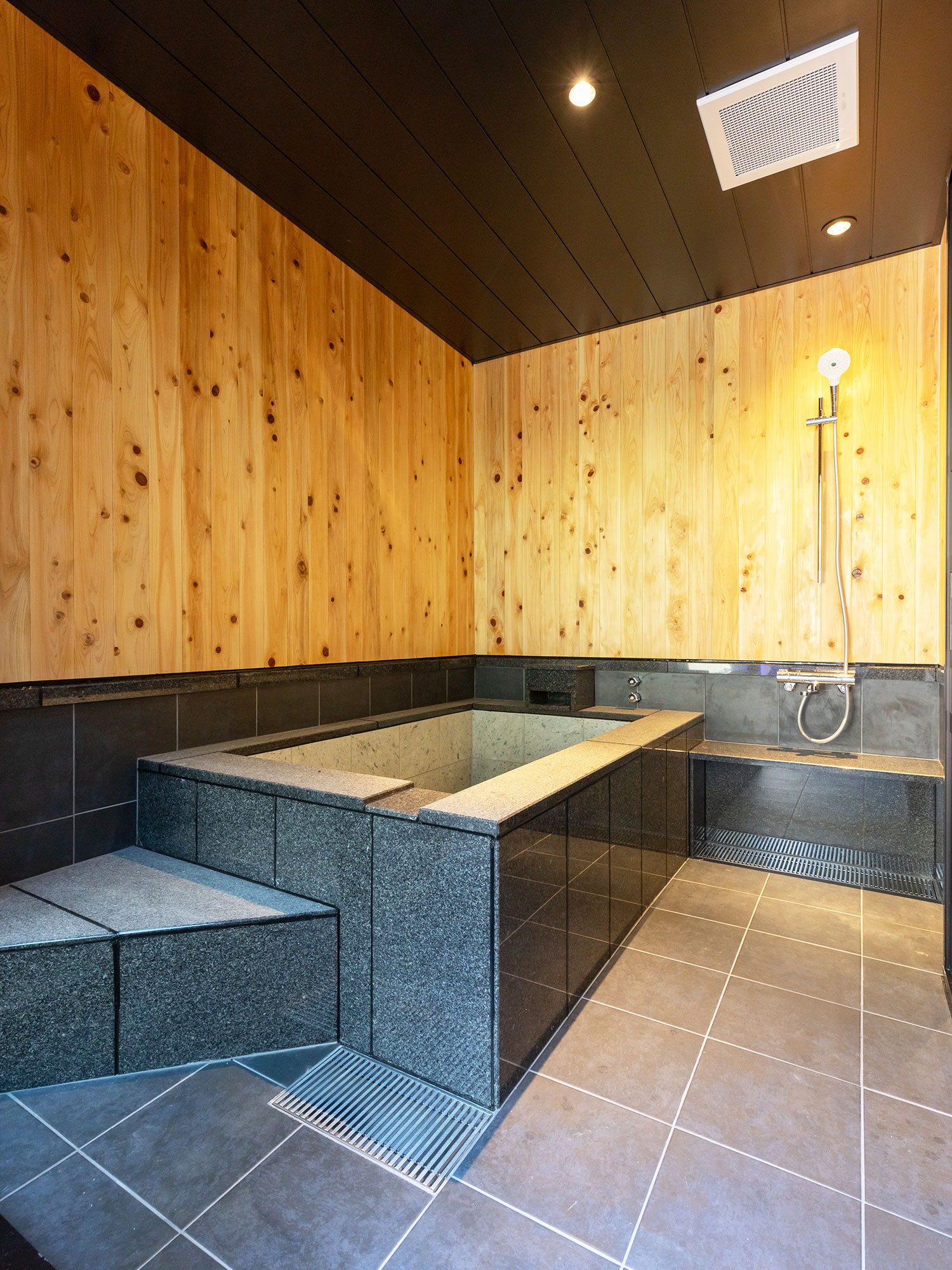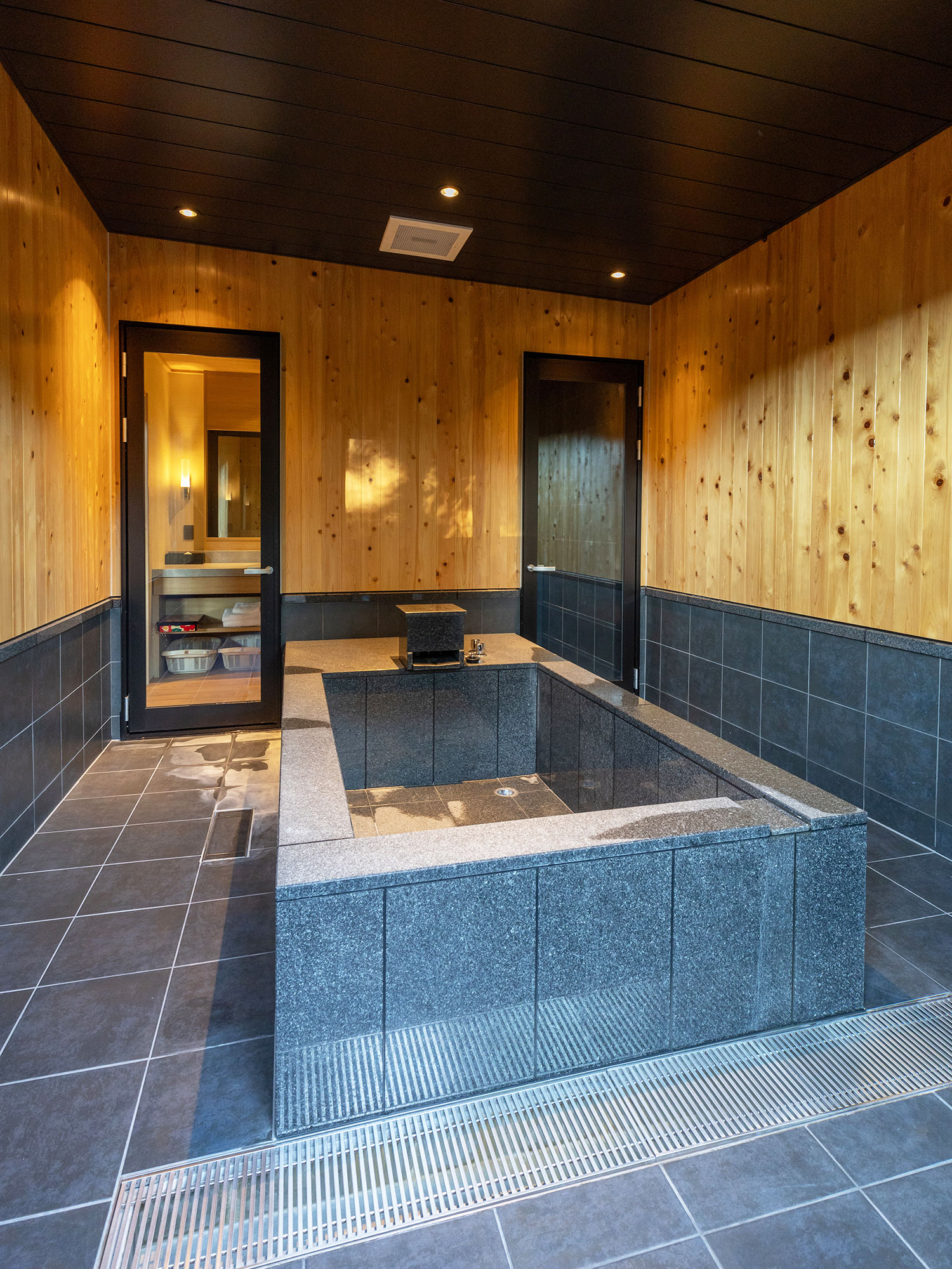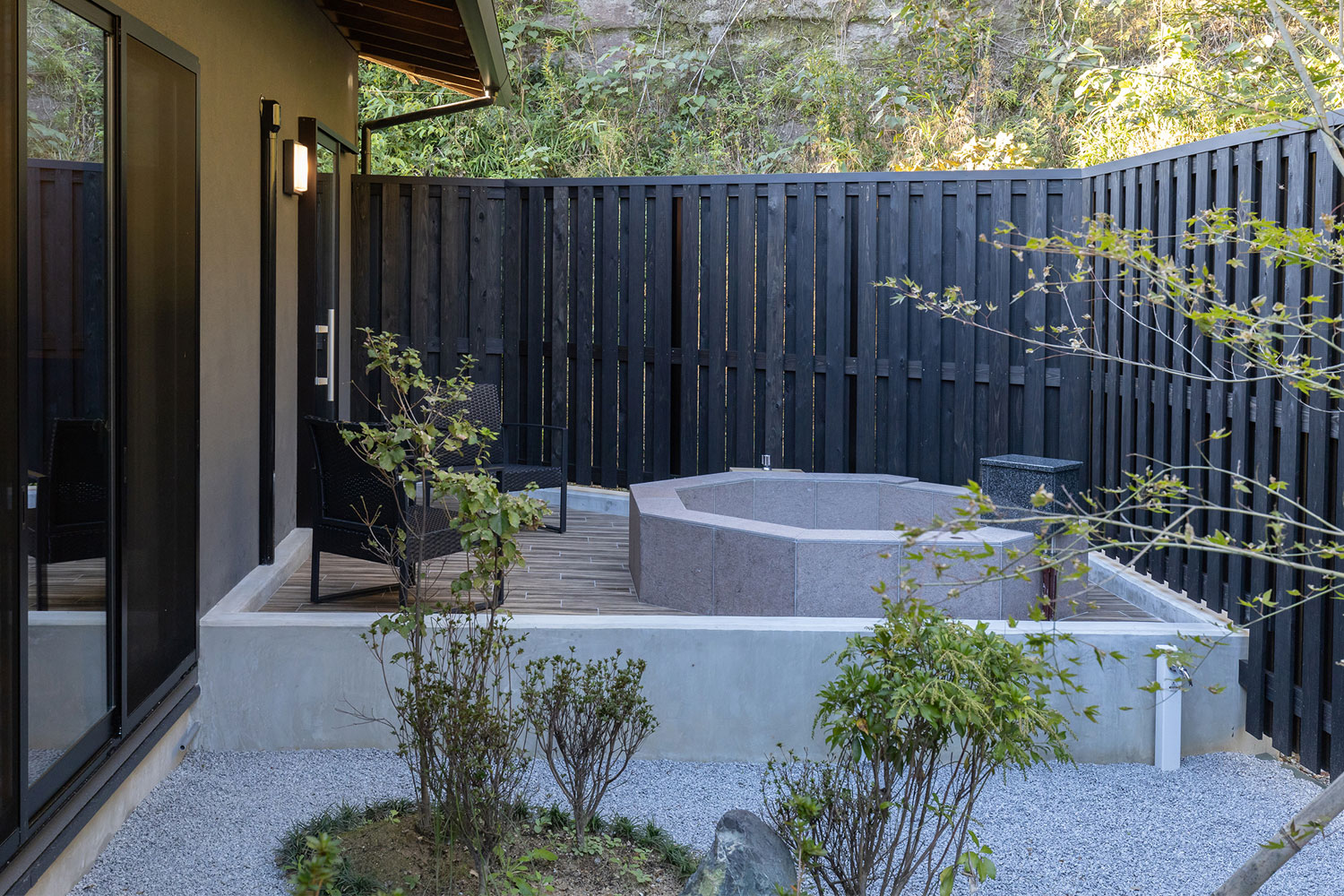 全部で8棟設けた客室は各室全てに露天風呂と内湯付の分棟となっており、専用庭を眺めながら自然の中でゆったりくつろげる空間となっている。