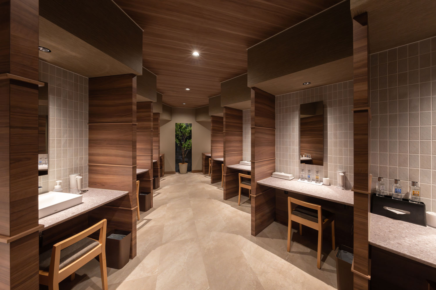 脱衣室は広々とした設計とし、個室型パウダールームを完備。プライバシーと快適性を両立した空間が、リゾートホテルとしての上質さを際立たせる。湯上がり処にはアジアンテイストのしつらえを施し、穏やかな照明と自然素材の調和がリゾートの余韻を演出する。