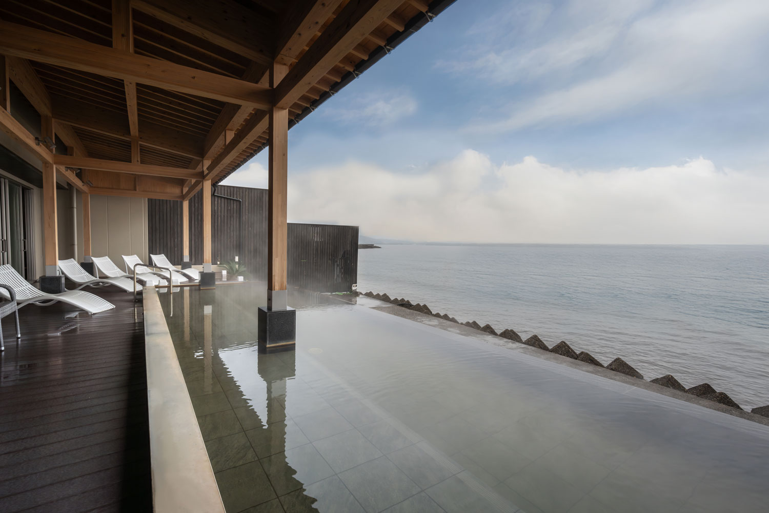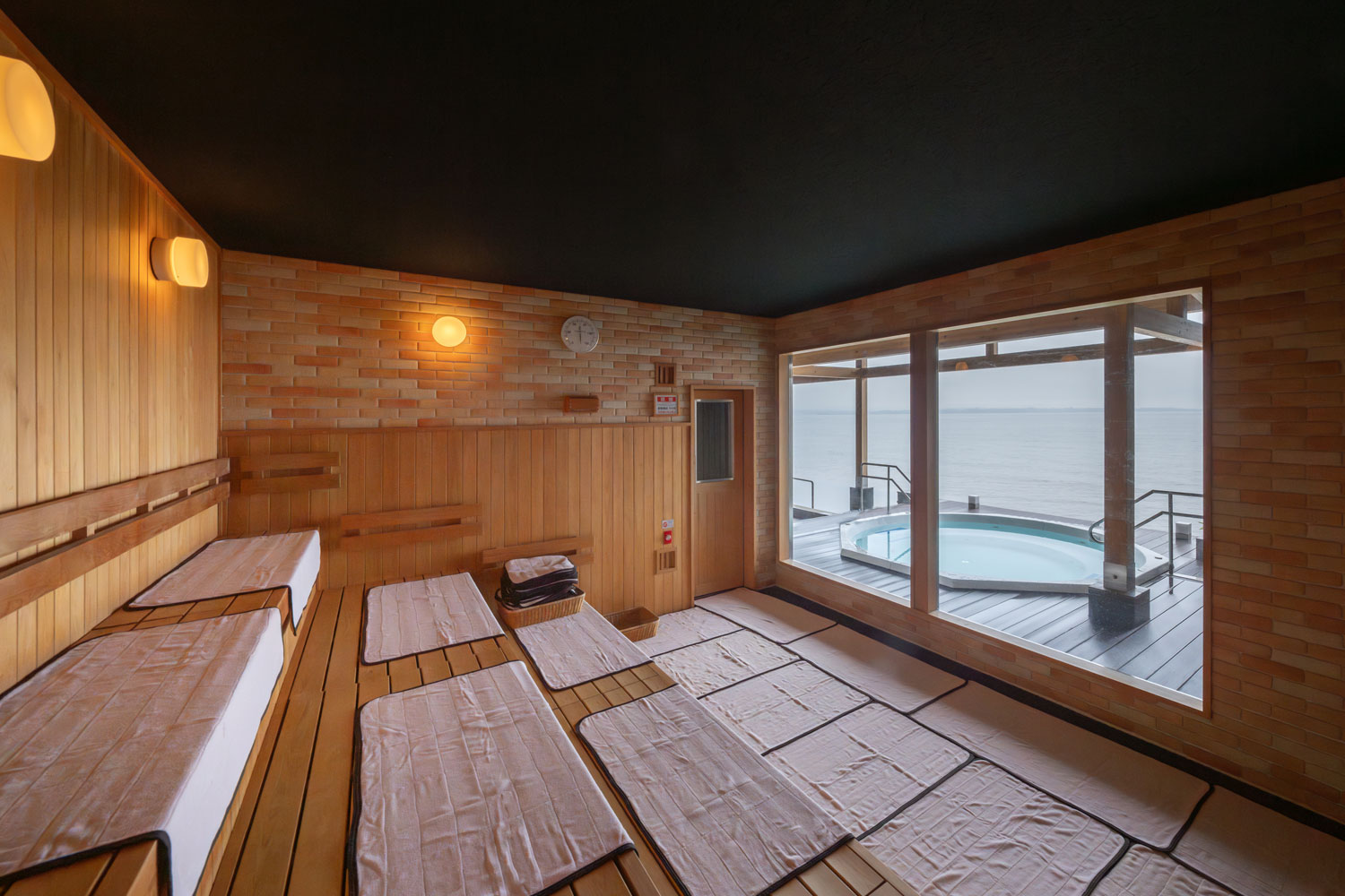 海と温泉が一体となるように設計された全長10mを超えるインフィニティ露天風呂では、潮騒とともに刻一刻と変化する海景を愉しむことができる。その湯面は空と溶け合い、まるで海に浮かぶような至高の湯浴み体験を提供する。さらに、20名以上がゆったりと利用できる海に面したサウナと、波音をBGMに心身を解き放つジャクジーを併設。外気浴スペースには“ととのう”ための潮風に包まれたリラクゼーションテラスを設け、別府ではこれまでにない開放感と上質な癒しを体現する大浴場が完成した。