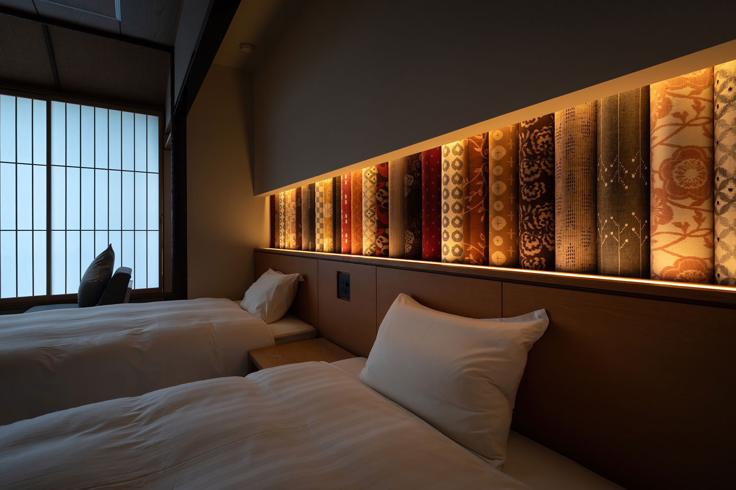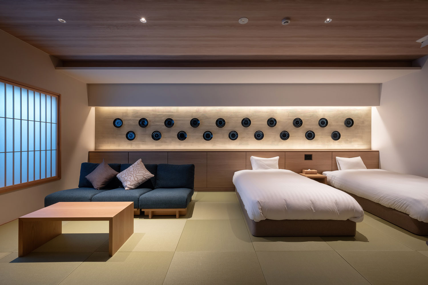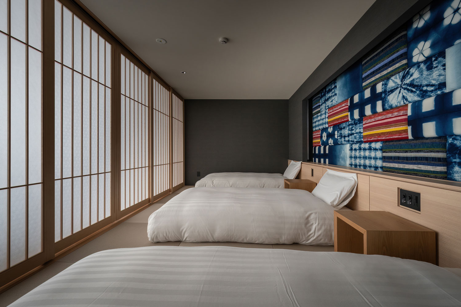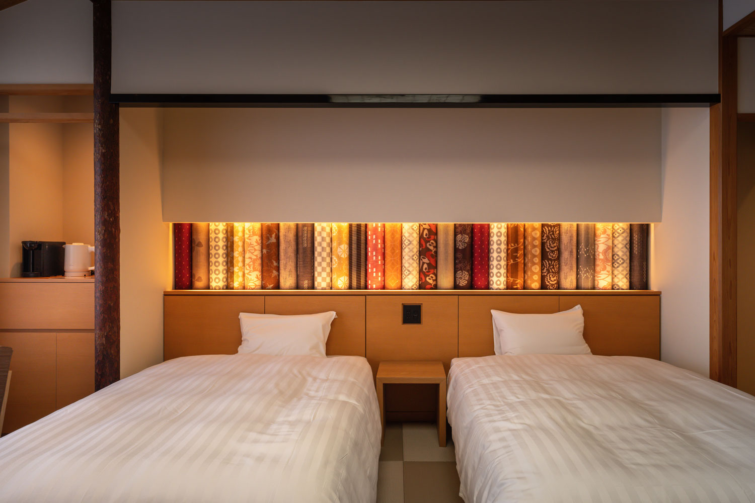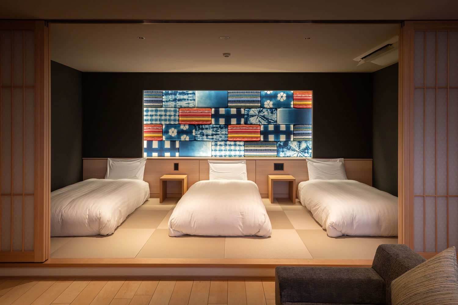 今回の改修は「令和5年度観光庁地域一体となった観光地の再生・観光サービスの高付加価値化事業」を利用して、客室、湯上り処、お土産処、外壁の改修工事を行った。客室は地域の伝統工芸を空間に取り入れたいという施主の思いから、ヘッドボード上部に甘木絞り、久留米絣、小石原焼(秀山窯)の装飾を施した内装とし、旅館の顔であるエントランスにも甘木絞りの暖簾と日除け幕の取り付けを行った。