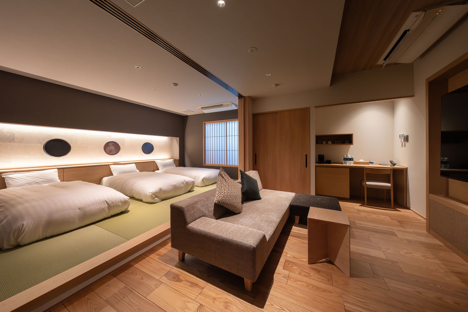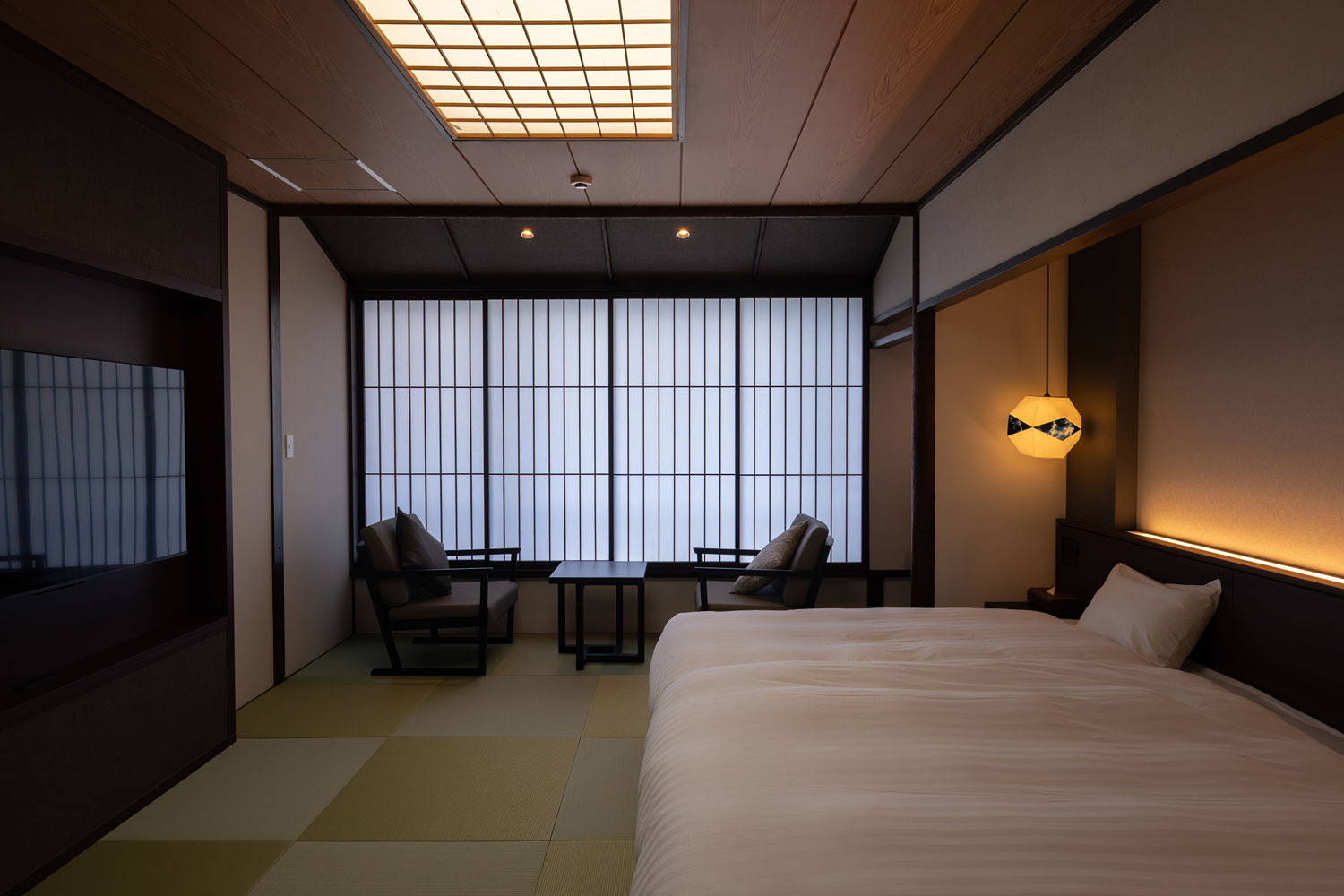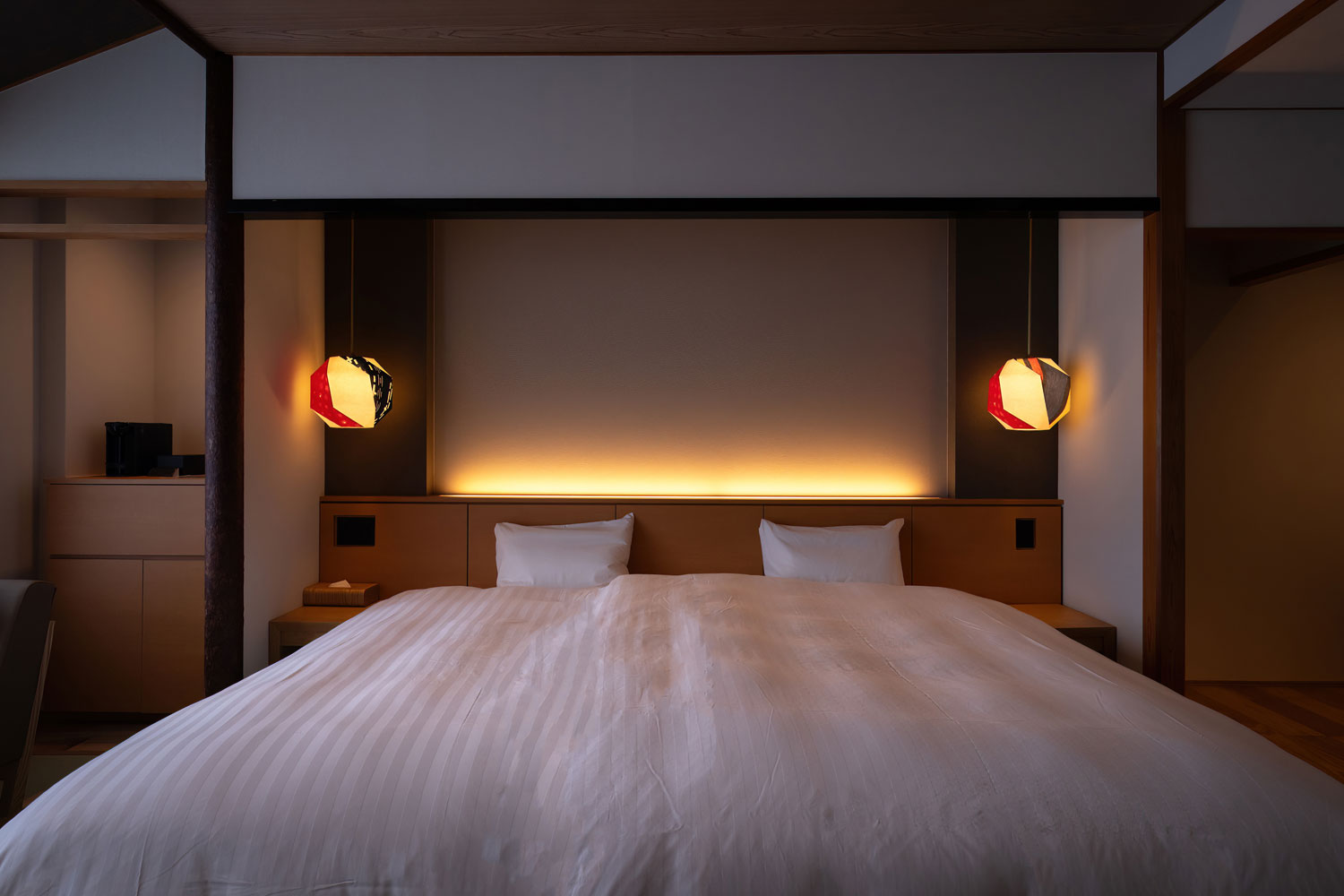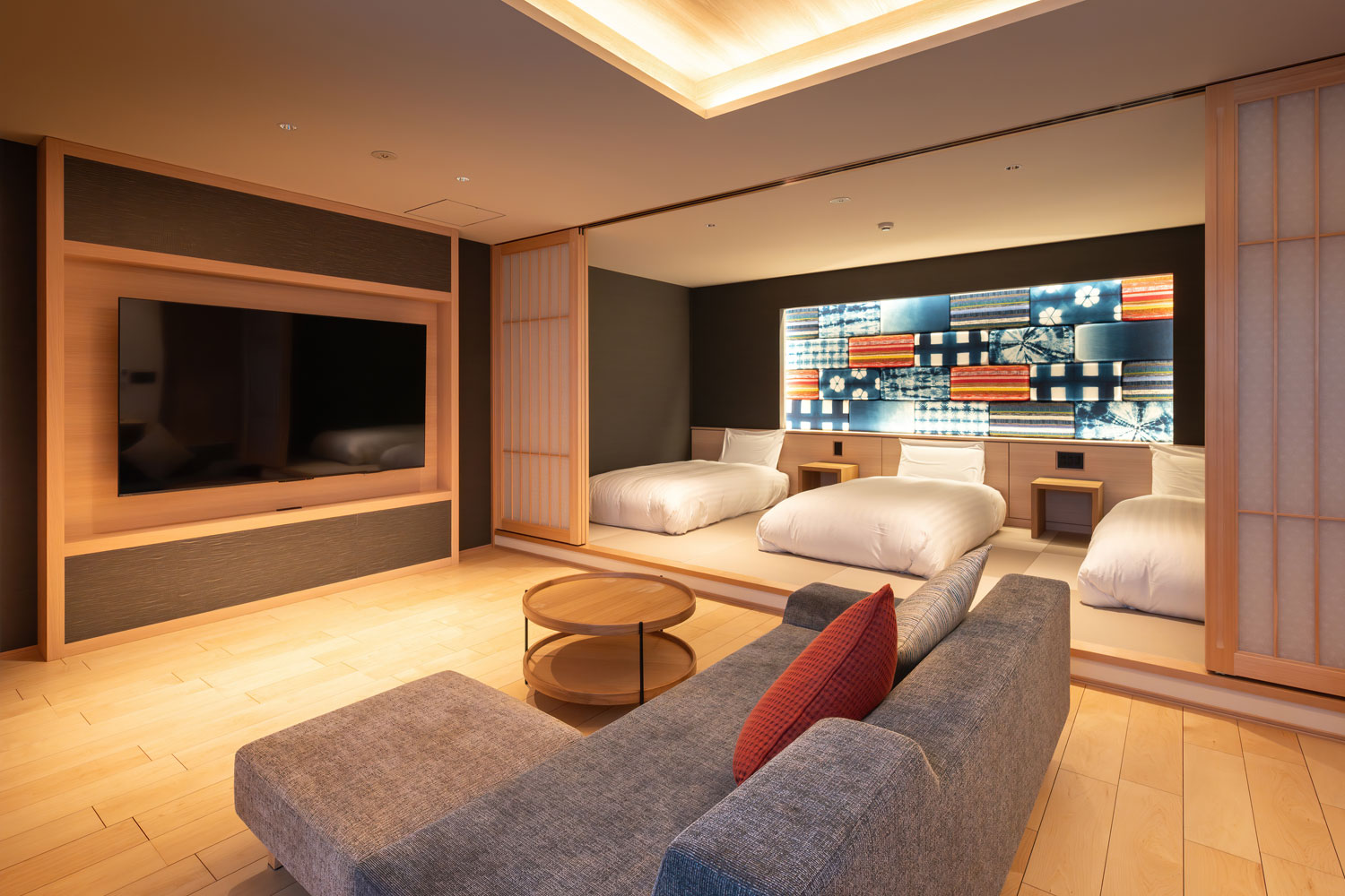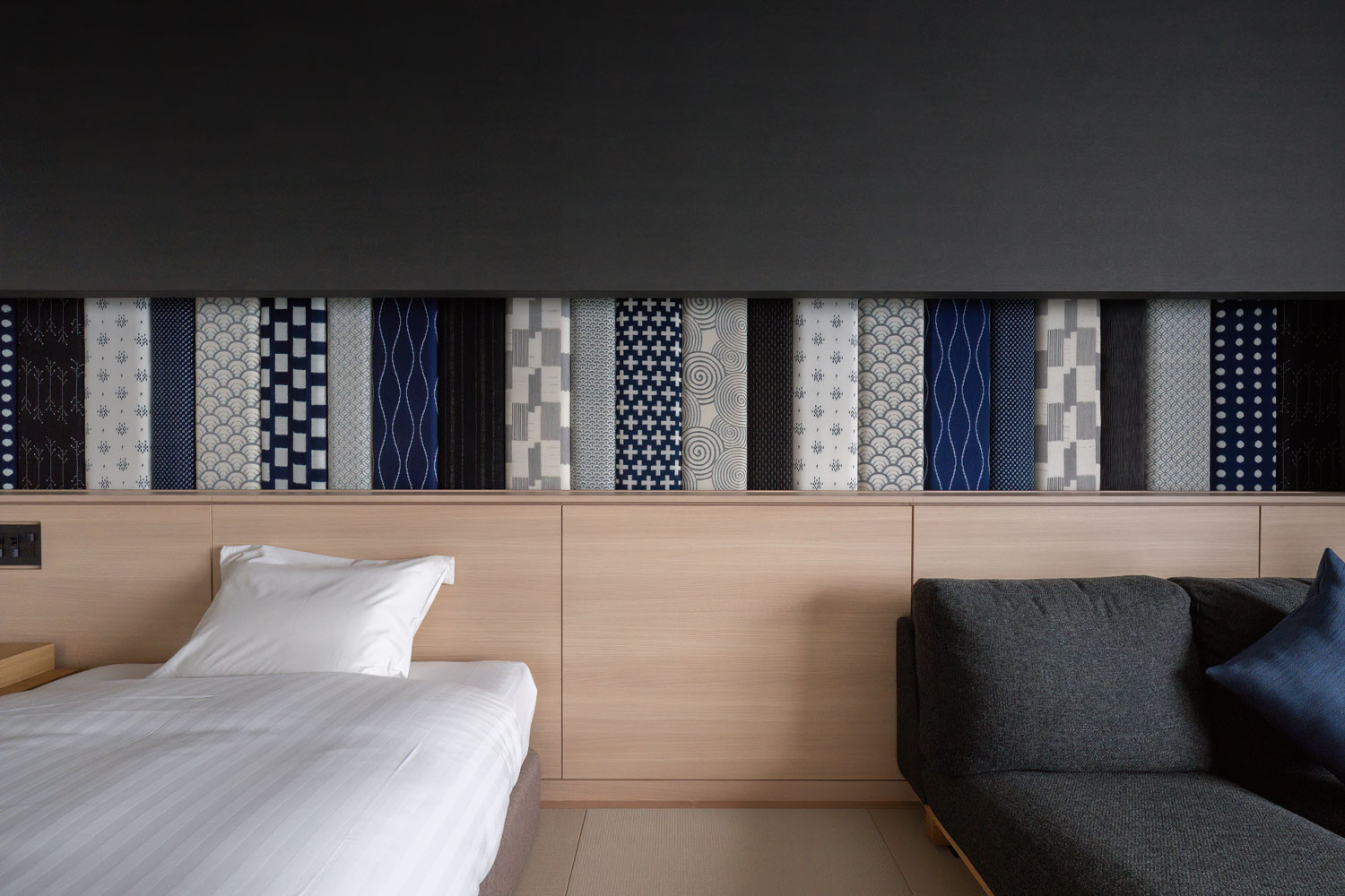 今回の改修は「令和5年度観光庁地域一体となった観光地の再生・観光サービスの高付加価値化事業」を利用して、客室、湯上り処、お土産処、外壁の改修工事を行った。客室は地域の伝統工芸を空間に取り入れたいという施主の思いから、ヘッドボード上部に甘木絞り、久留米絣、小石原焼(秀山窯)の装飾を施した内装とし、旅館の顔であるエントランスにも甘木絞りの暖簾と日除け幕の取り付けを行った。