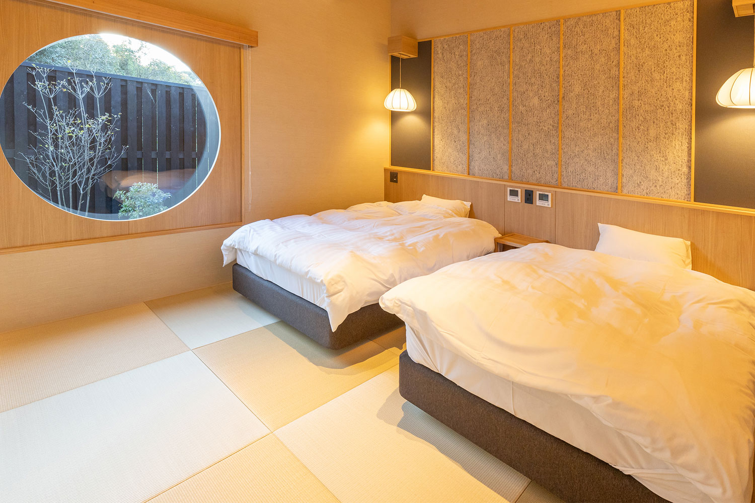 全部で8棟設けた客室は各室全てに露天風呂と内湯付の分棟となっており、専用庭を眺めながら自然の中でゆったりくつろげる空間となっている。