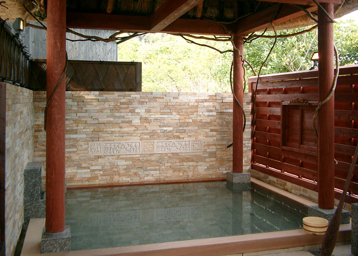 無垢の湯は、バリの神秘性をキーワードにテクスチャーを選択し、ゆとり、開放性の中で、人間がもつストレスの解放を考えました。バリのイメージをそのまま模倣するのではなく、イメージを連想させながら日本人の感性に同調させるようなデザインにすることにより、末永く、飽きないデザインになったと考えています。夫婦の湯は家族特に夫婦を対象にしています。御神木の木の下で大小の陶器風呂(夫婦茶碗)をイメージし、また2匹のカエルがハスの葉であまやどりするようなコミカルなイメージでデザインされています。