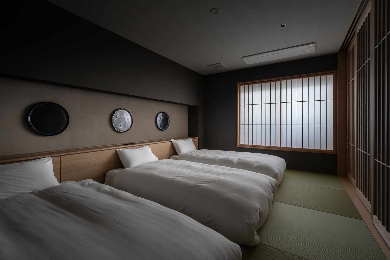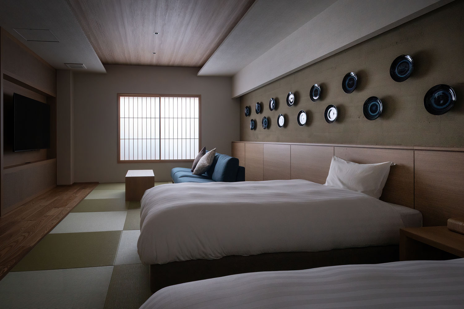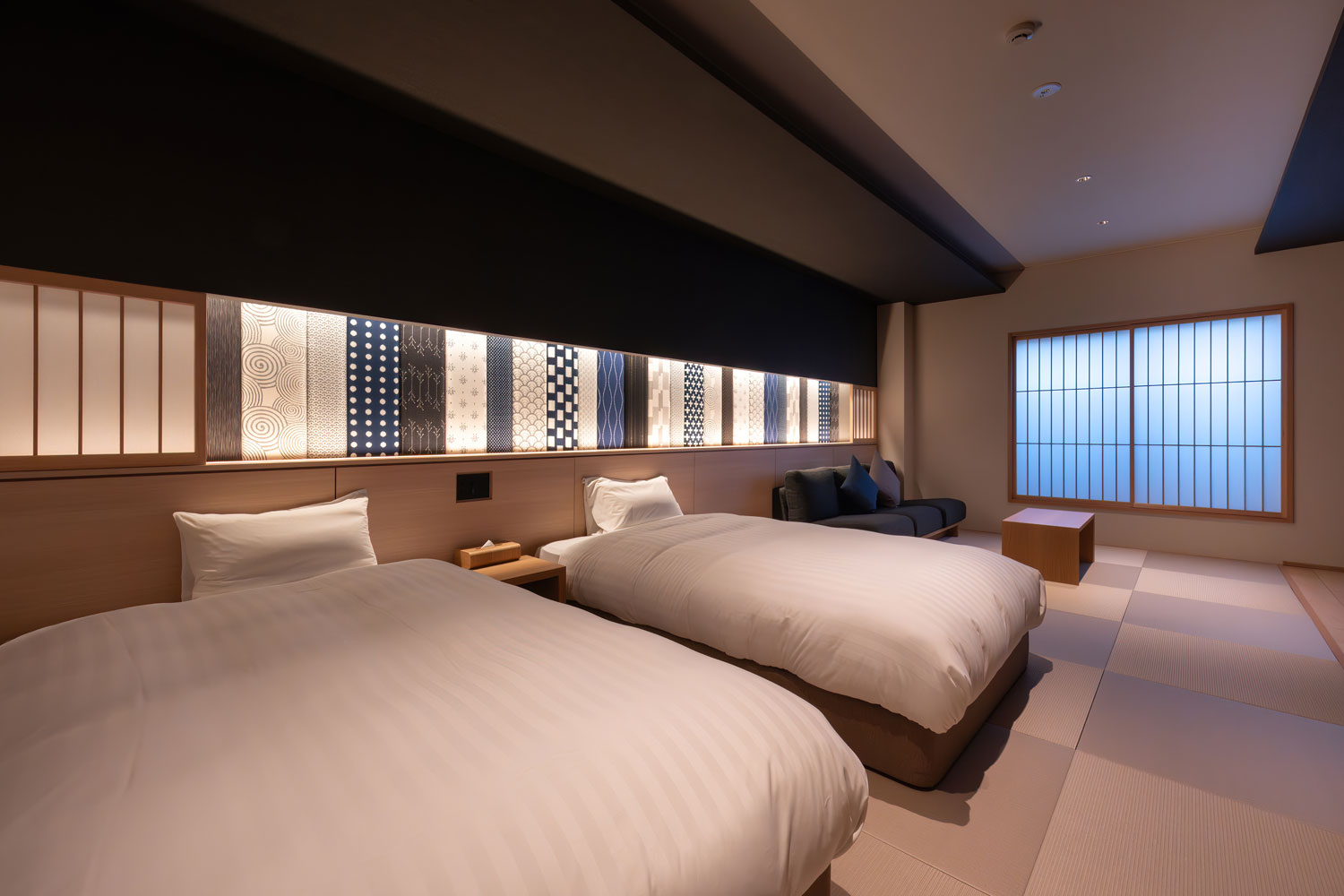 今回の改修は「令和5年度観光庁地域一体となった観光地の再生・観光サービスの高付加価値化事業」を利用して、客室、湯上り処、お土産処、外壁の改修工事を行った。客室は地域の伝統工芸を空間に取り入れたいという施主の思いから、ヘッドボード上部に甘木絞り、久留米絣、小石原焼(秀山窯)の装飾を施した内装とし、旅館の顔であるエントランスにも甘木絞りの暖簾と日除け幕の取り付けを行った。